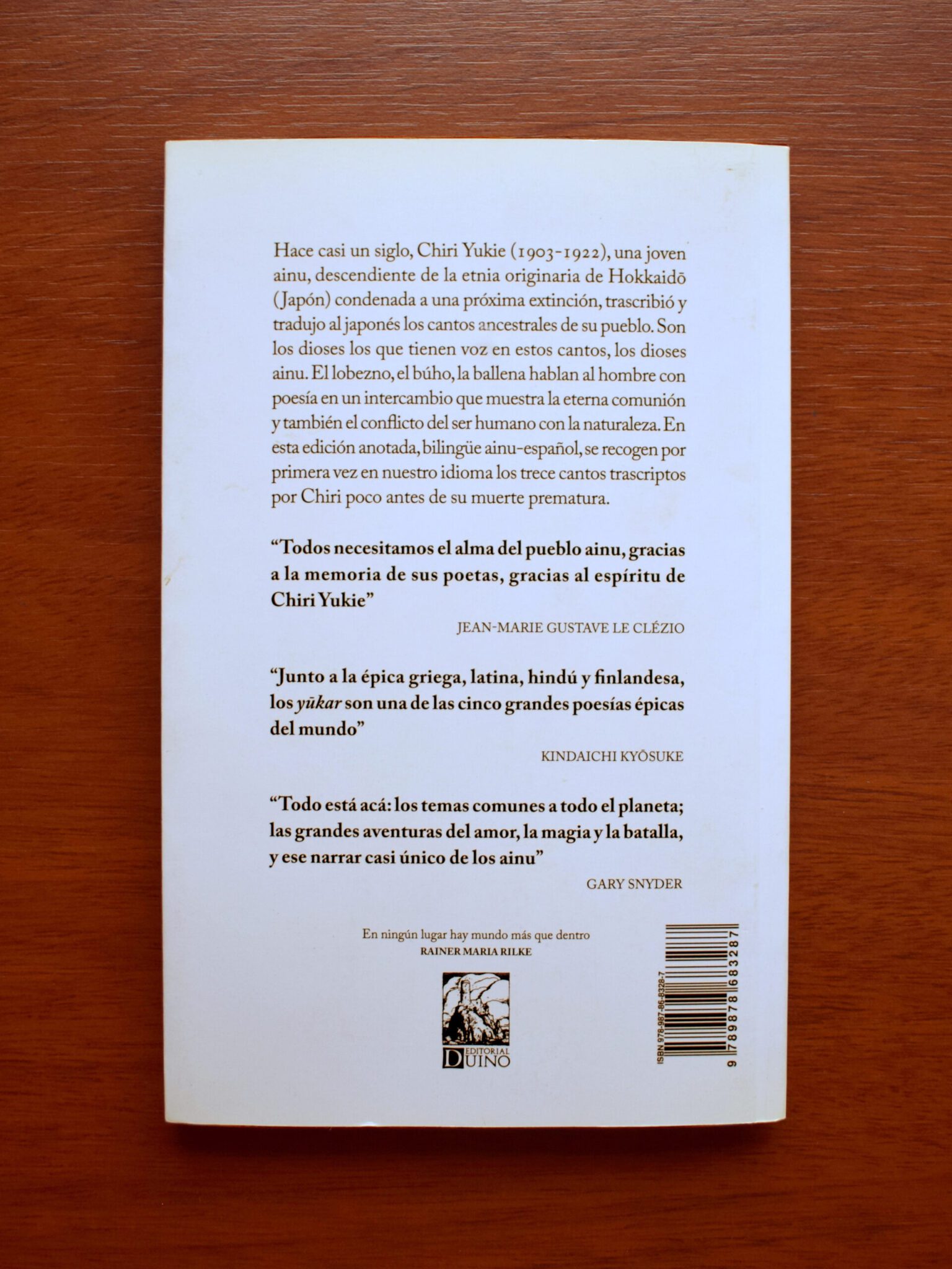 Hace casi un siglo, Chiri Yukie (1903-1922), una joven ainu, descendiente de la etnia originaria de Hokkaidō (Japón) condenada a una próxima extinción, trascribió y tradujo al japonés los cantos ancestrales de su pueblo. Son los dioses los que tienen voz en estos cantos, los dioses ainu. El lobezno, el búho, la orca hablan al hombre con poesía en un intercambio que muestra la eterna comunión y también el conflicto del ser humano con la naturaleza. En esta edición bilingüe ainu-español (con traducción, estudio preliminar y notas de Gustavo Beade) se recogen por primera vez en nuestro idioma los trece cantos (el Ainu Shin’yōshū) trascriptos por Chiri poco antes de su muerte prematura.